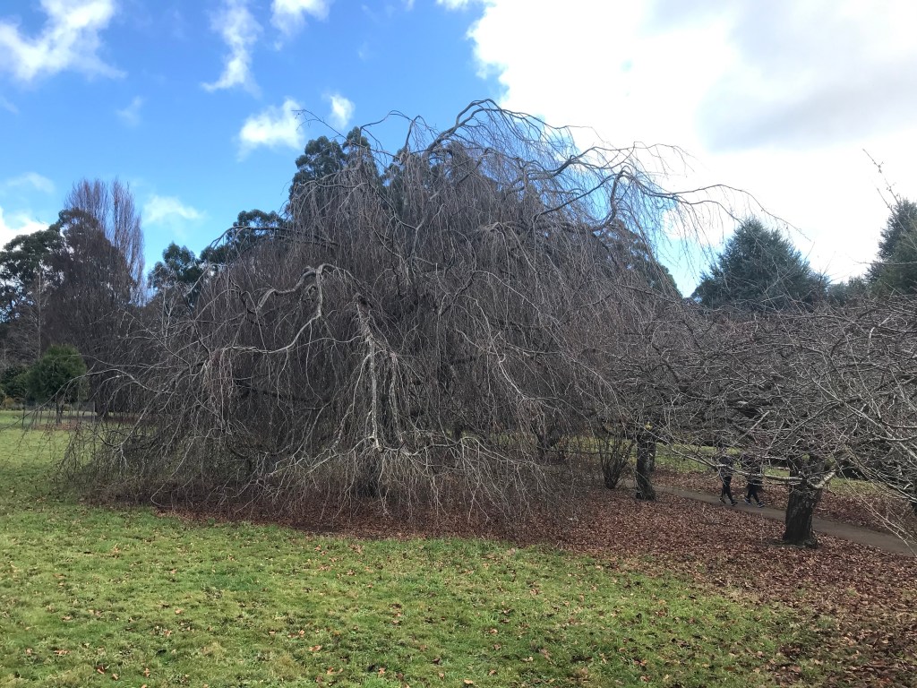 Yesterday, the eight of June, a public holiday for the queen’s birthday, we drove to Olinda to walk to Sassafras and back. We parked the car close to the Rhododendron Gardens and could not resist popping in. Many of the trees and shrubs had shed their leaves, and flowers were a rare sight. But the gardens had not bowed out for the winter. Abundant grace and nobility surrounded us. At the very least, a tree devoid of leaves bursts with the promise of impending glory. This was eloquently present along a cherry tree avenue. Unashamedly naked, almost exhibitionist in the way they flaunted their alluring shape, the trees cheerfully invited us to gawk at them. But the invitation extended to also see beyond bark, branch and twig. We pledged to return in spring.