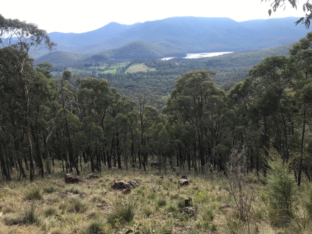 Two days ago we climbed Mount Riddell in the Healesville area. A tough, unrelenting climb of almost six kilometres that grew steeper as we neared the summit, such as it was. We were already warned not to expect refreshing, reviving scenic vistas at the end of the exhausting ascent, but I couldn’t help being disappointed by what greeted me: just a picnic table and benches in an open area surrounded by forest, one big part of which was fenced off because it enclosed a water catchment. A narrow track opposite the prohibited area was tempting to follow, but the notes about the climb did not say anything about it. And the bench was too inviting. We had a spot of lunch and returned, downhill all the way. Not the best walk we have ever done. There are more gruelling walks in the area, scaling Saint Leonards for instance, which promises a feast of visual splendour. Mount Riddell promised no such rewards for effort. Still, at one point along the way the forest opened up to reveal a stunning view of the valley with the Maroondah reservoir set against a backdrop of mountains. It made the pain and sweat almost worthwhile.