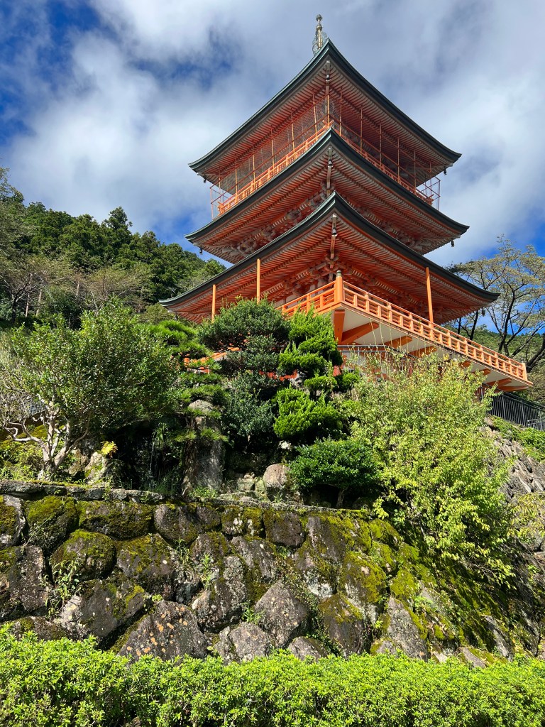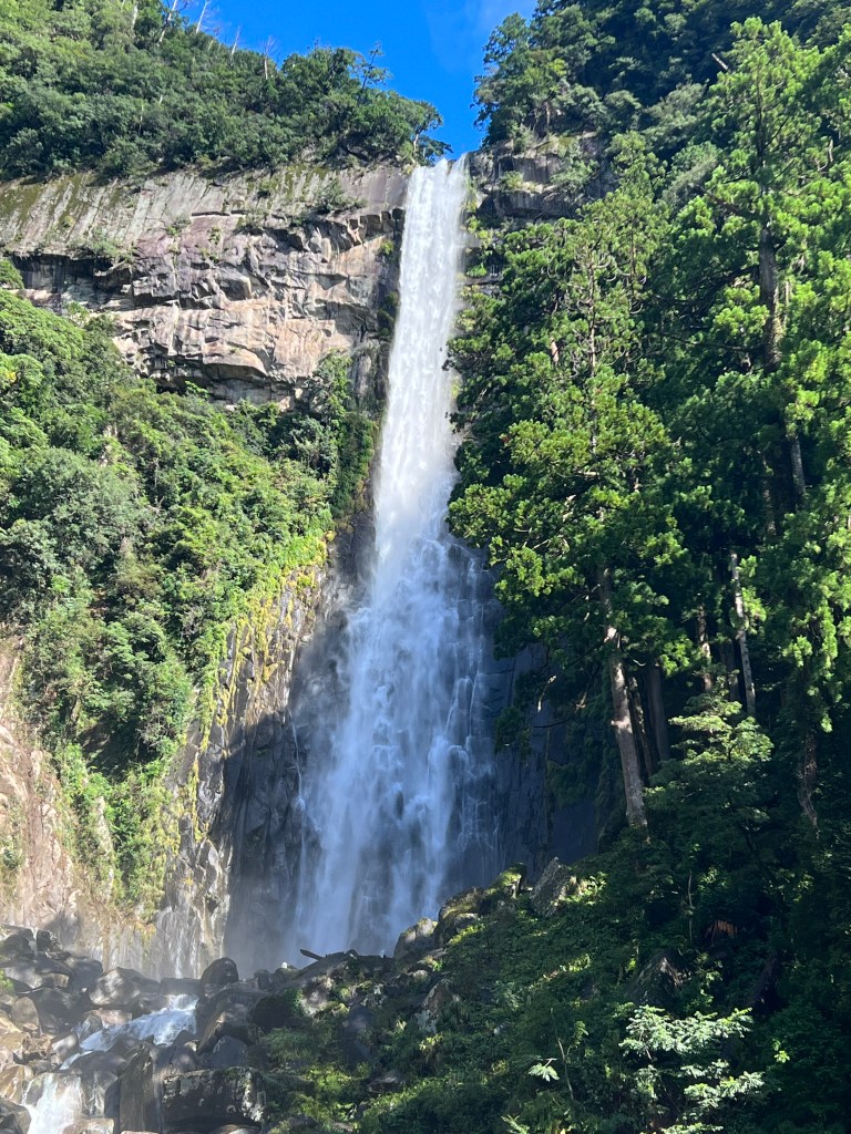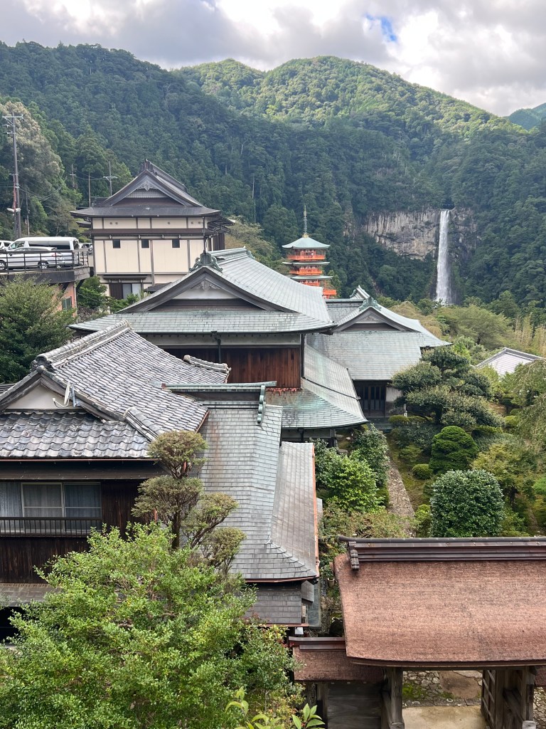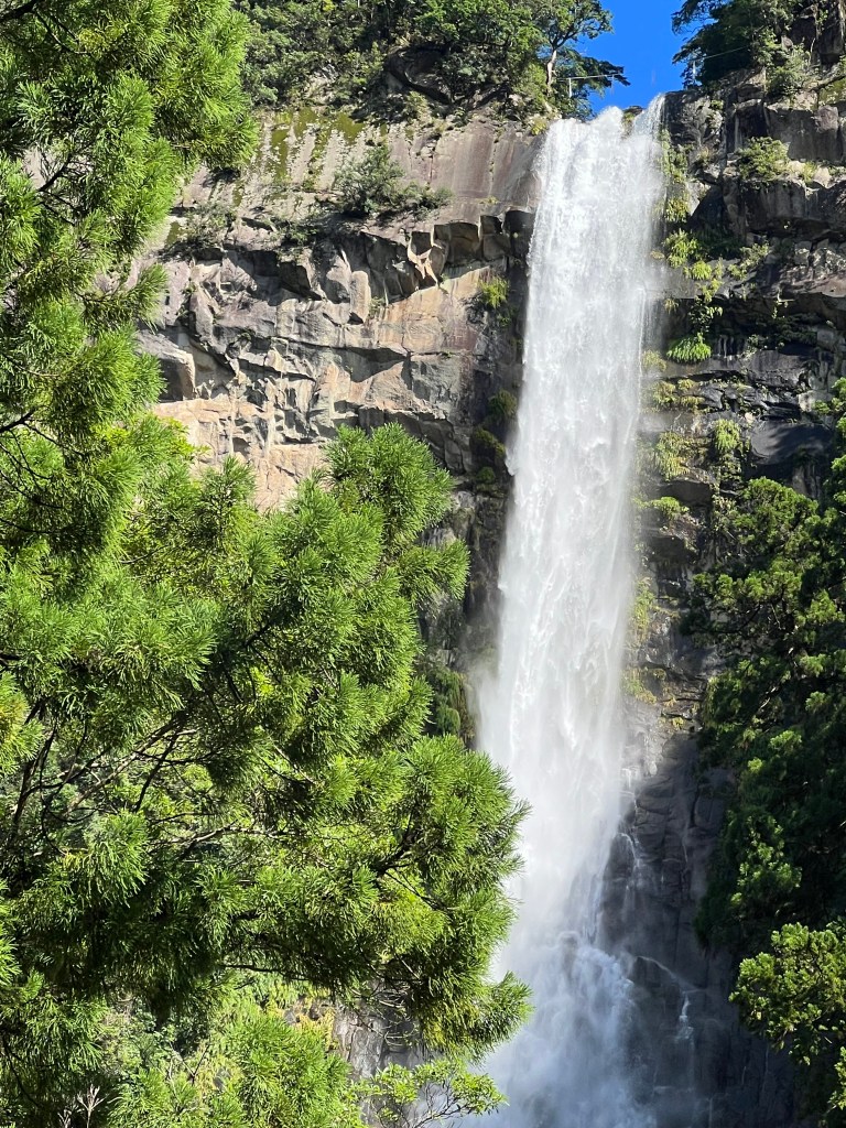 The longest and steepest walk: 16 kilometres with an 800-metre ascent in the first 3 or 4 kilometres. The descent to Nachi, our destination, was treacherous in places. All worth it. The Nachi shrine is a complex of temples. At one end is Nachi Falls, Japan’s highest waterfall, also a shrine.