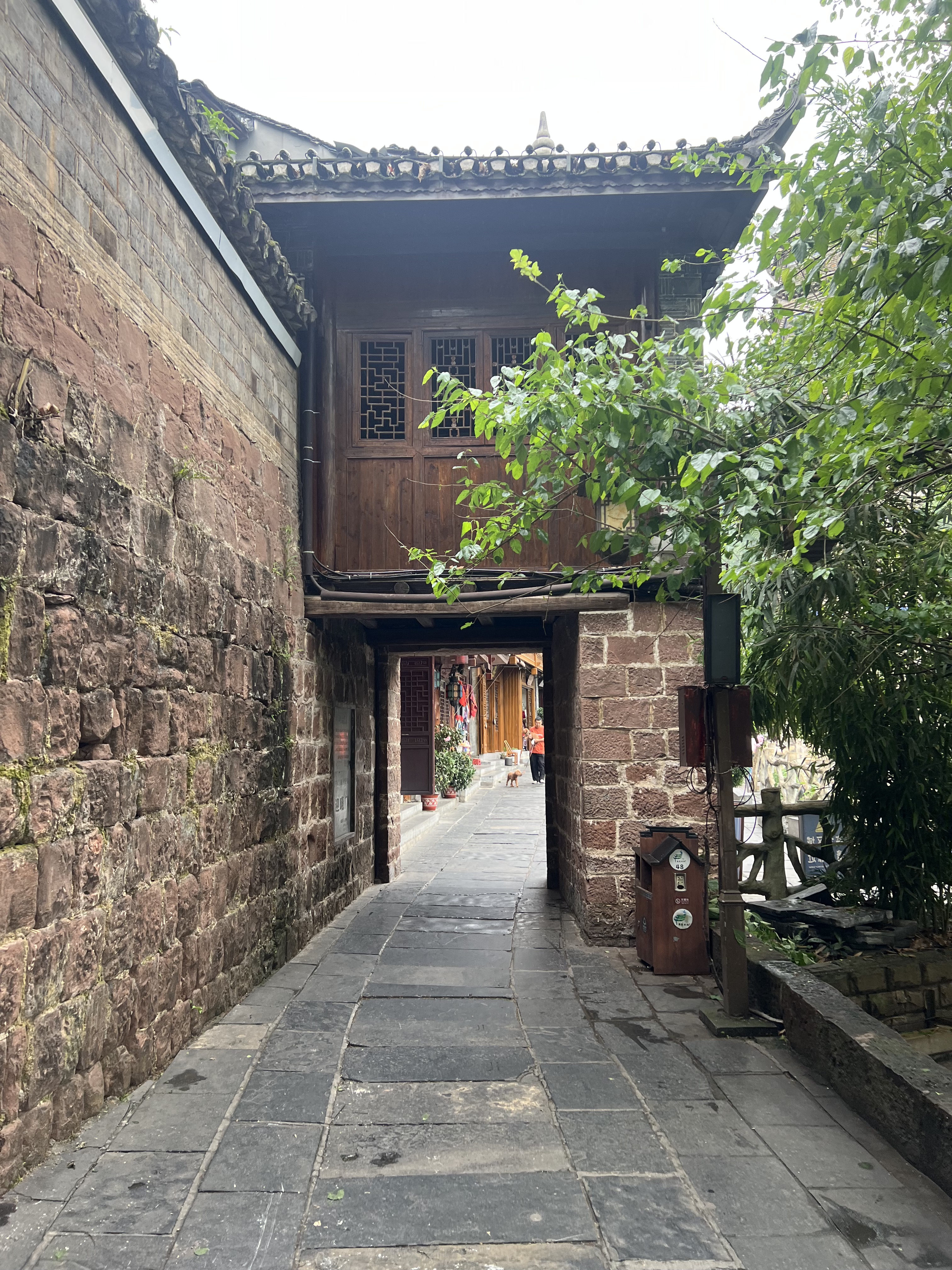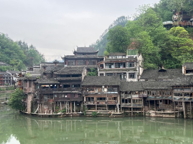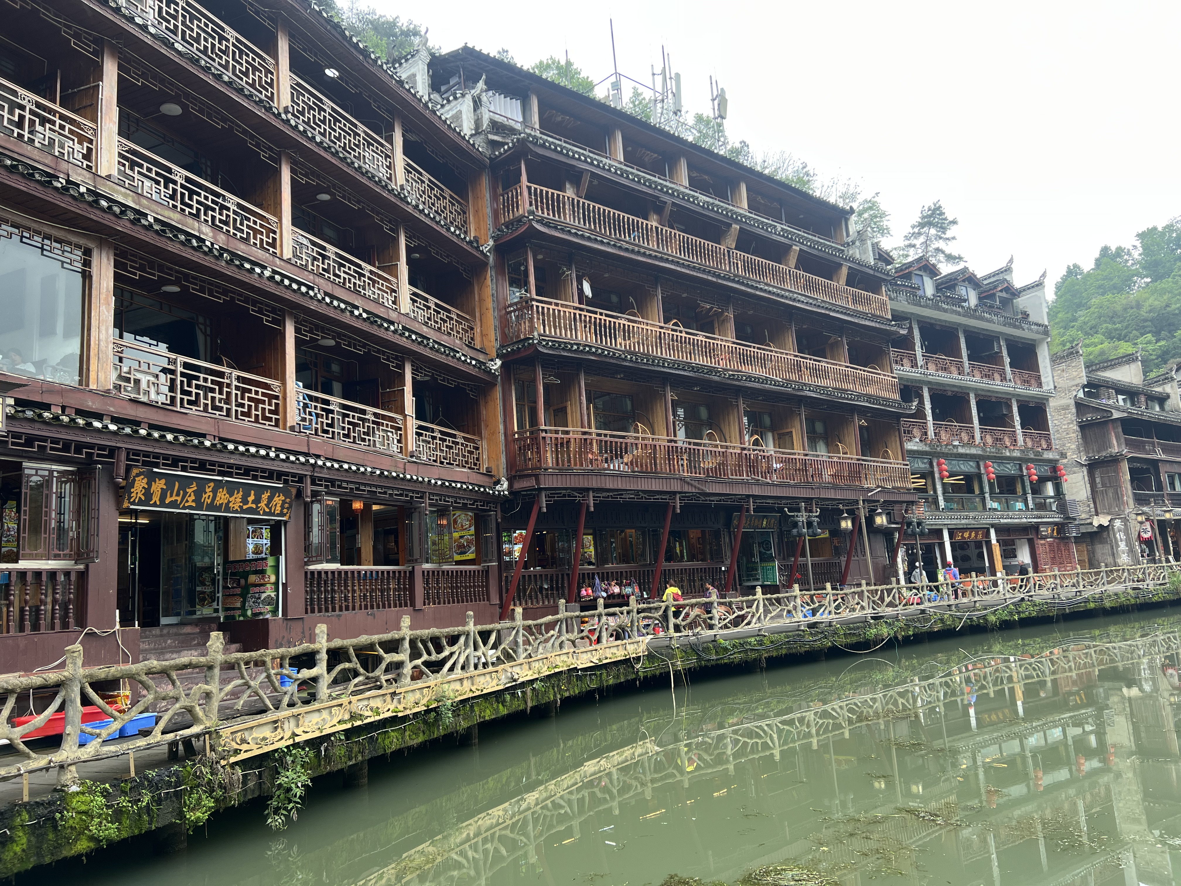 Grey and occasionally rainy in Zhangjiajie, it is a good day for not trekking in national parks or on mountaintops. Hopefully, it will be dry in Fenghuang. We get there at midday. The weather is bleak but dry even though I see a few threatening clouds. We take a bus to a modern-looking town. I see no sign of ancient dwellings. We are dropped off in front of a modern building with an escalator, which we are directed to ascend. After a short walk we emerge onto a large courtyard from where we faithfully follow signposts that take us towards a river. The buildings here are not new, but they don’t have an ancient feel. Close to the river we pass through an ornate gateway and the setting changes. This is more like it. We are in the ancient town. Very old buildings are crowded on both sides of the river. From a distance they look like empty relics of a past age, but when we reach them they turn out to be hives of activity. There are shops, homes, cafes. Fenghuang is 300 years old only on the outside. We walk along the riverbank and narrow alleys. The dwellings are mostly pasted together as one would expect.