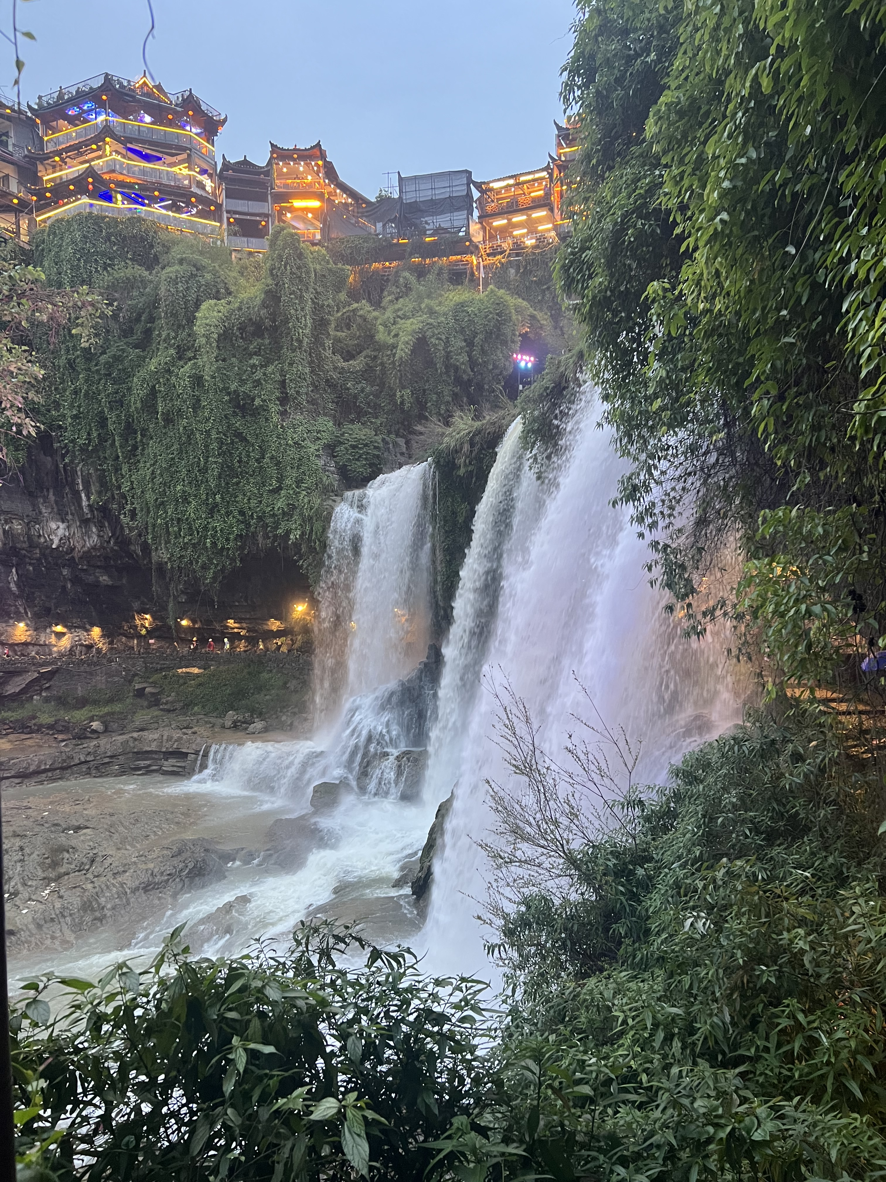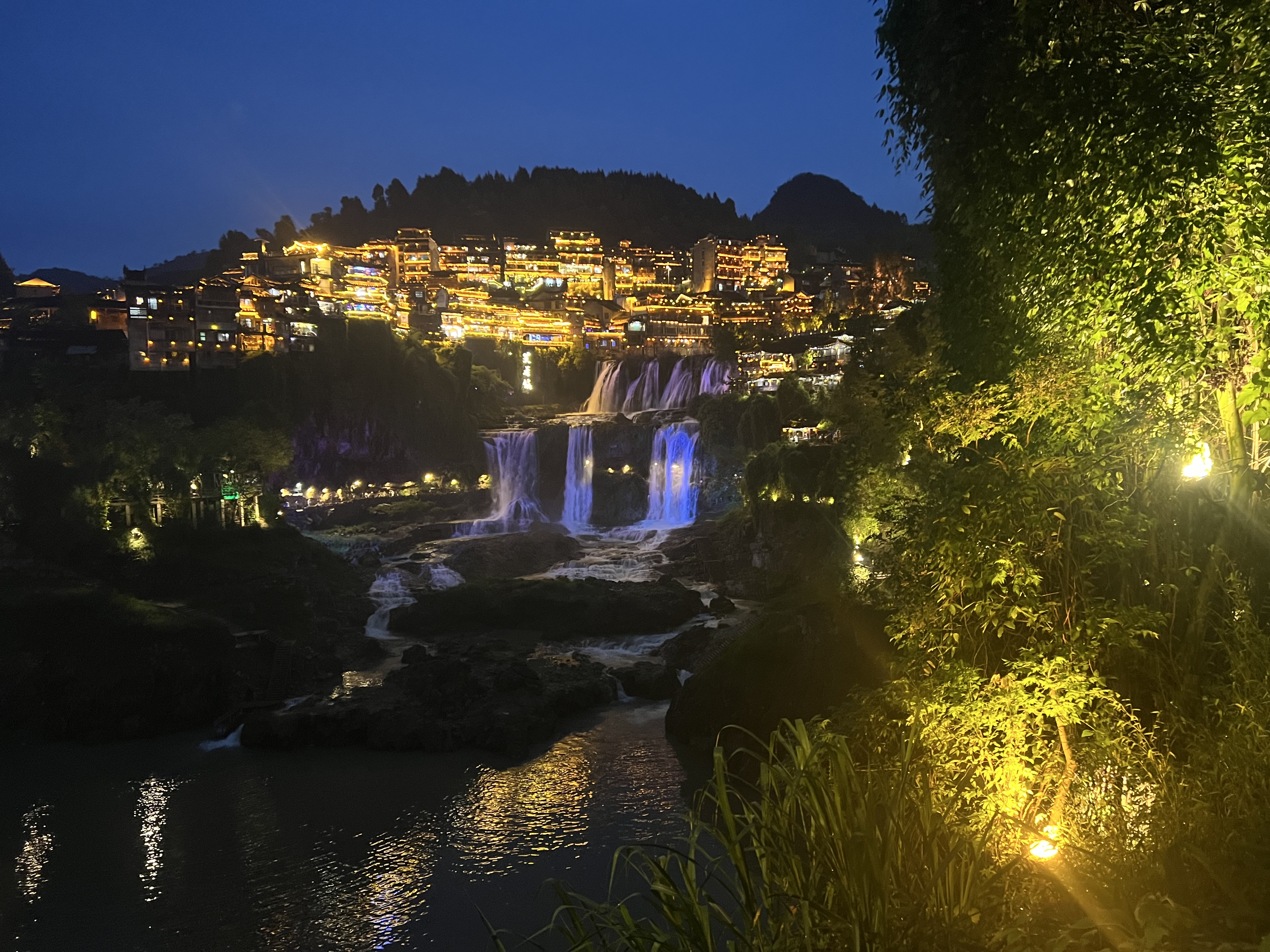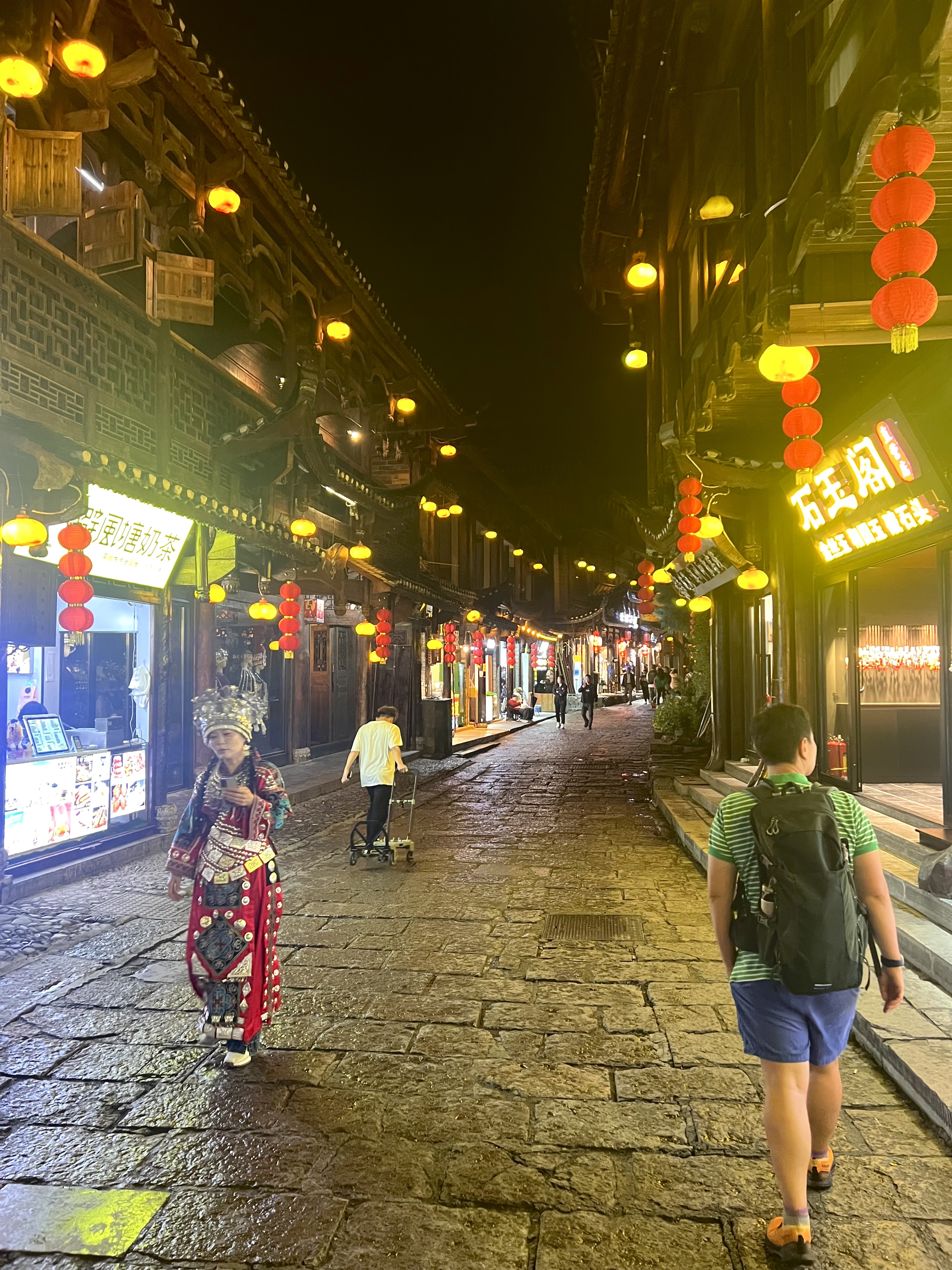Furong is a crowd of wooden dwellings jostling for position on a hillside that overlooks a two-tiered waterfall gushing down over rocks into a river. It doesn’t always gush. At the height of the dry season it diminishes to a sad trickle. The town is shaped like a horseshoe around the waterfall. In daytime it looks like an old, dilapidated town leading a precarious existence on sloping ground, vulnerable to foundations softened up by rain. Those foundations couldn’t be anything stronger than tree trunks driven into the earth. How some of them hold up two and three storeys is impressive. At night Furong catches up with modernity and becomes a tourist precinct. The town is completely lit up, its age completely obscured by an indiscriminate torrent of yellow gloss. Spectacular though it may be, I prefer the humble matte finish of antiquity.