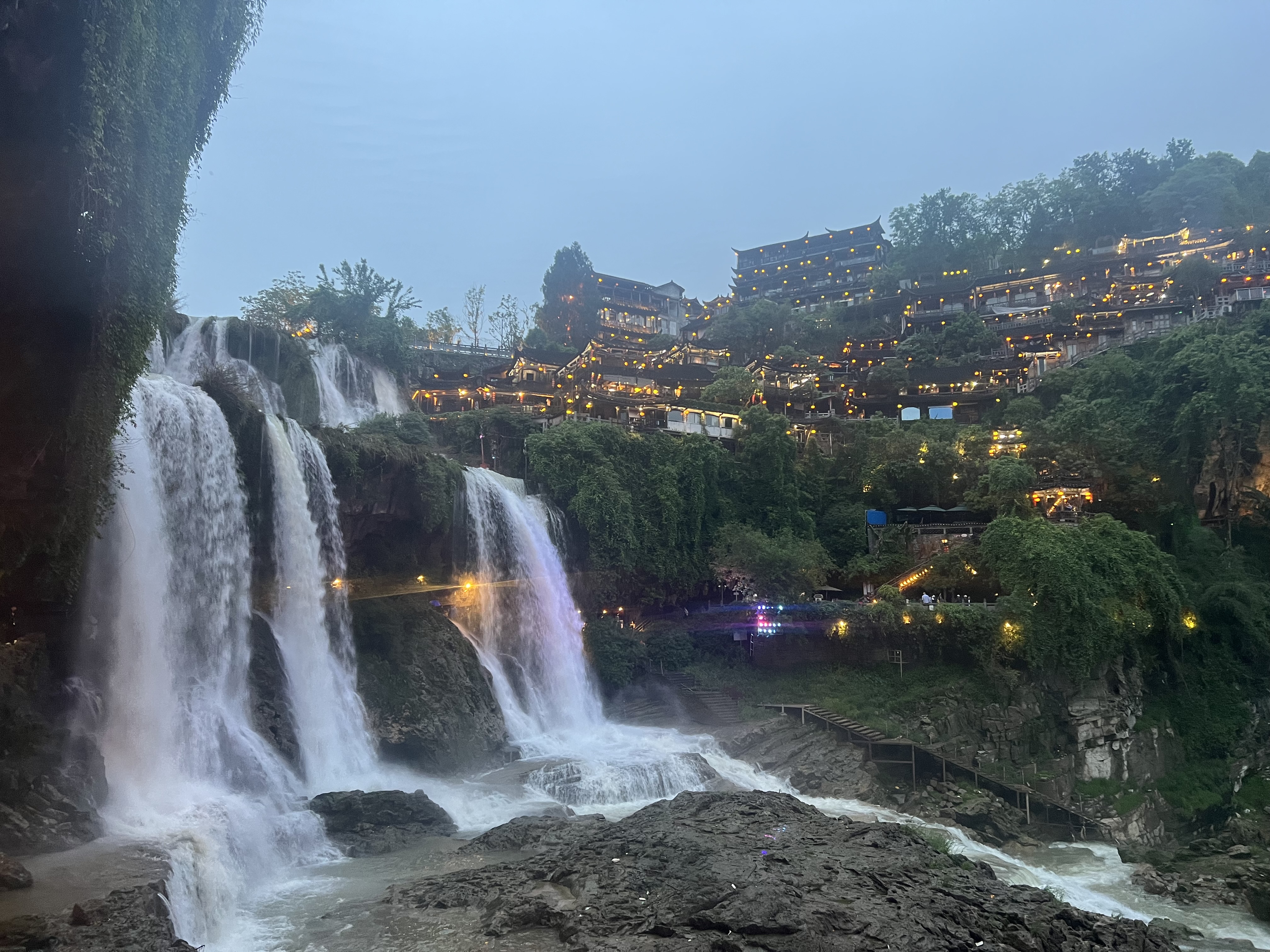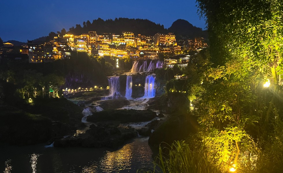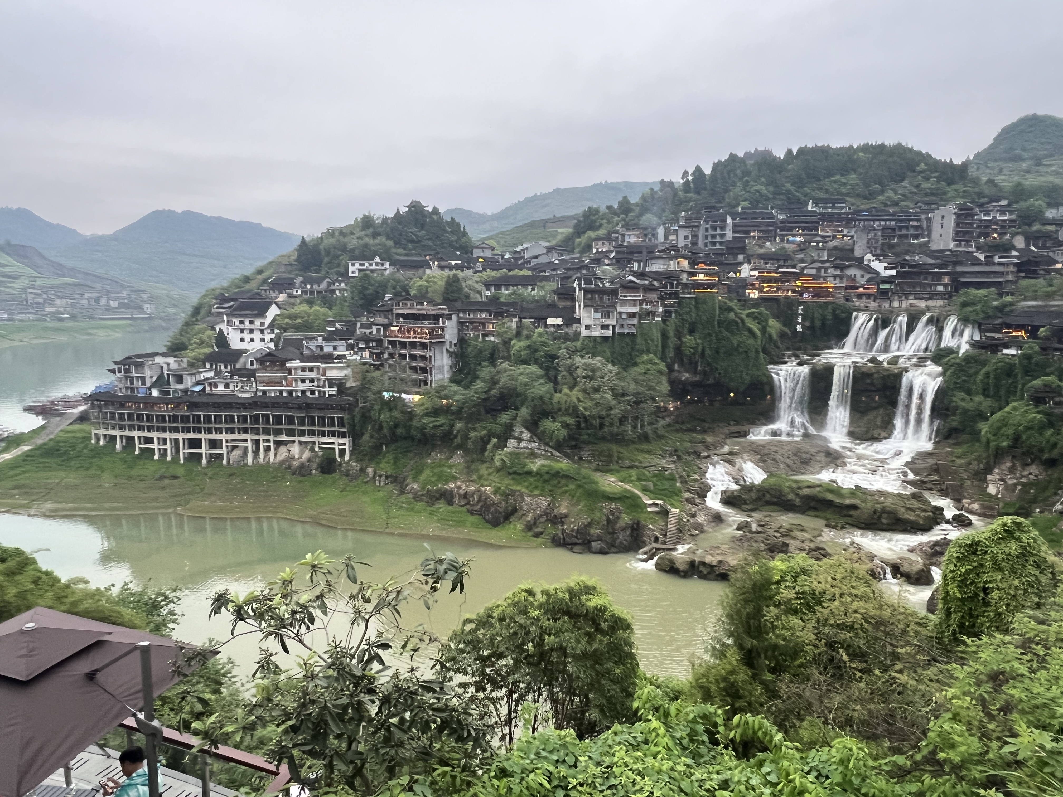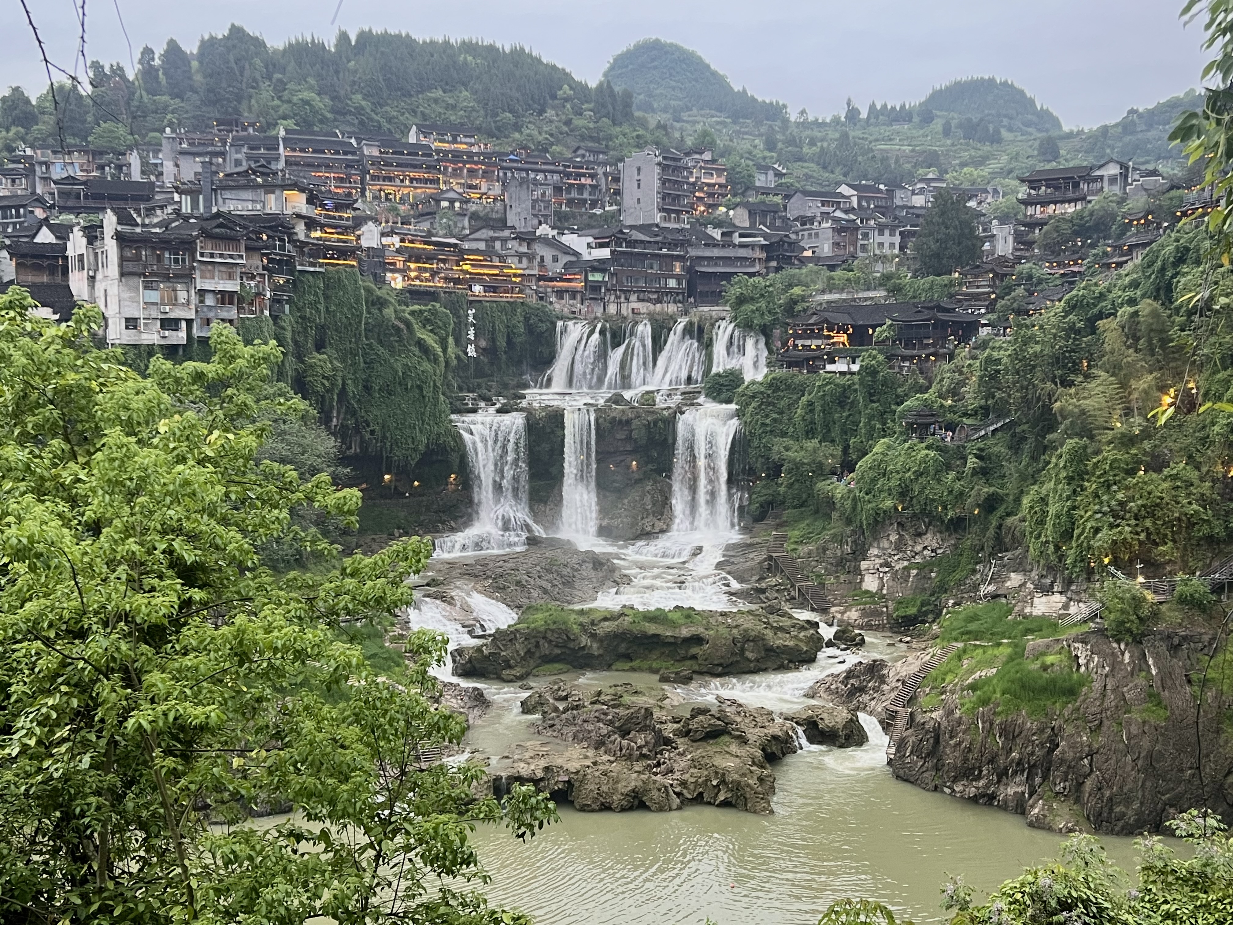 Furong is a crowd of wooden dwellings jostling for position on a hillside that overlooks a two-tiered waterfall gushing down over rocks into a river. It doesn’t always gush. At the height of the dry season it diminishes to a sad trickle. The town is shaped like a horseshoe around the waterfall. In daytime it looks like an old, dilapidated town leading a precarious existence on sloping ground, vulnerable to foundations softened up by rain. Those foundations couldn’t be anything stronger than tree trunks driven into the earth. How some of them hold up two and three storeys is impressive. At night Furong catches up with modernity and becomes a tourist precinct. The town is completely lit up, its age completely obscured by an indiscriminate torrent of yellow gloss. Spectacular though it may be, I prefer the humble matte finish of antiquity.