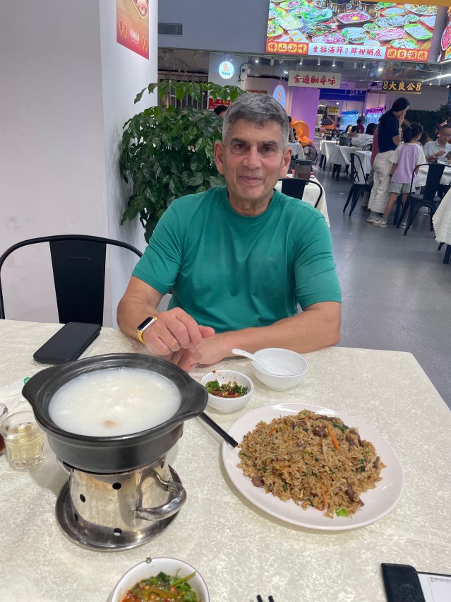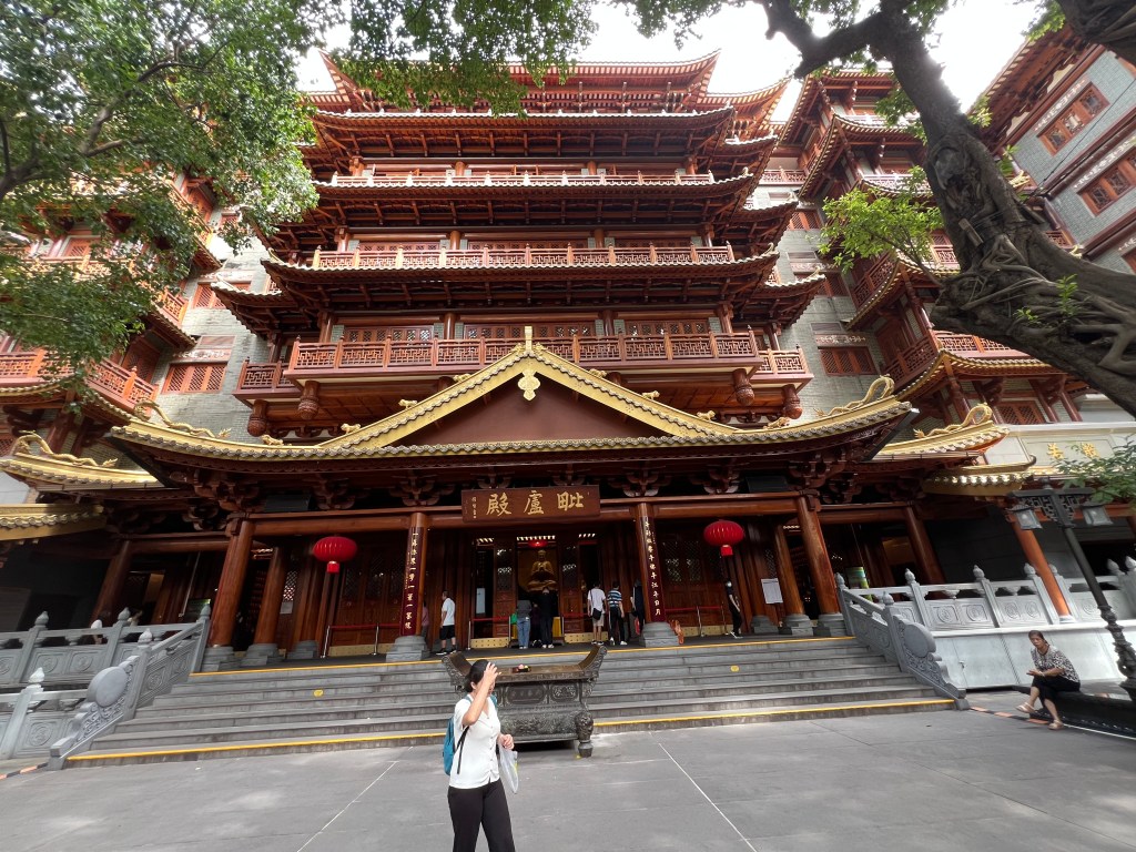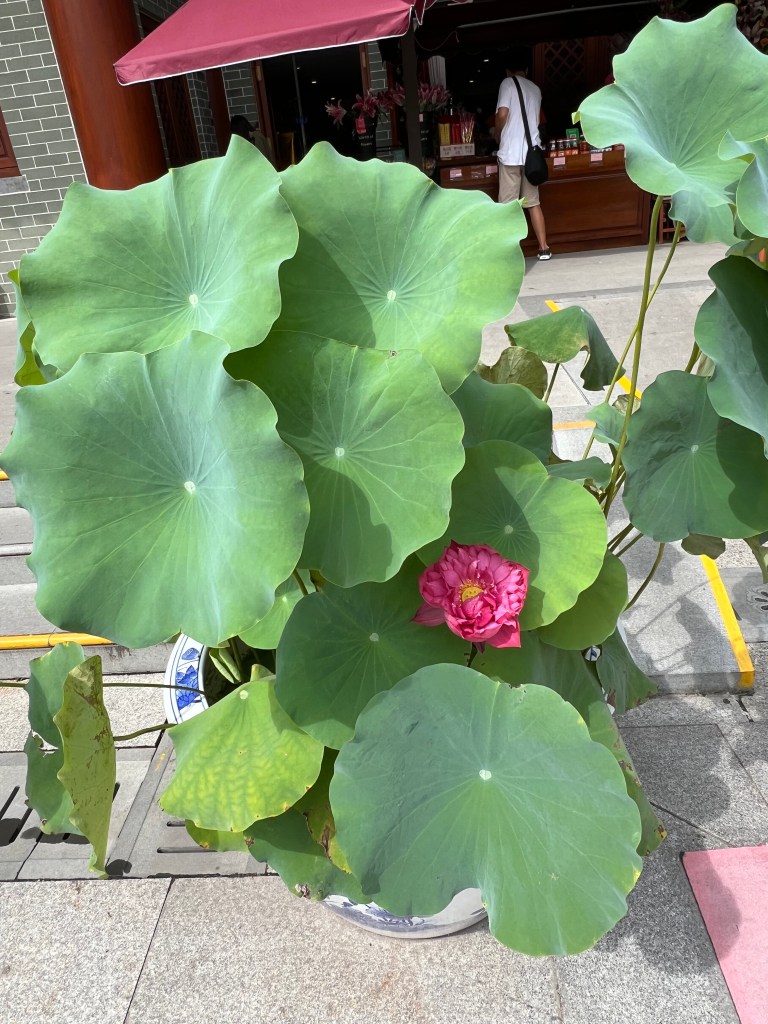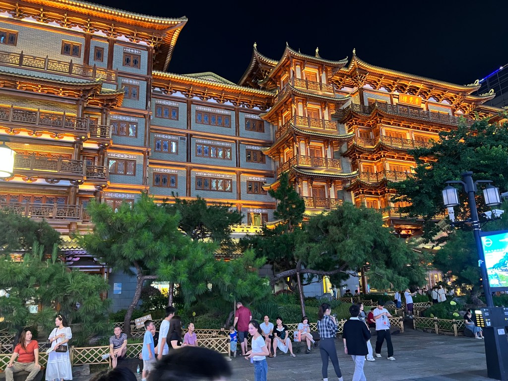 From Qinghui Park we take a DiDi to a restaurant recommended by a food blog for its roast goose. Large, cavernous, and mostly empty because it is early, the restaurant provides large, cheap servings of everything. I’m no roast goose gourmet. After that we visit a shopping precinct, stopping on the way at a hairdresser for Bock to have a haircut. It is lovely to escape the heat for an hour. For dinner we go to another recommended restaurant, this one a bit lavish, upmarket and expensive. We score highly a dish of eggplant deep-fried in batter.