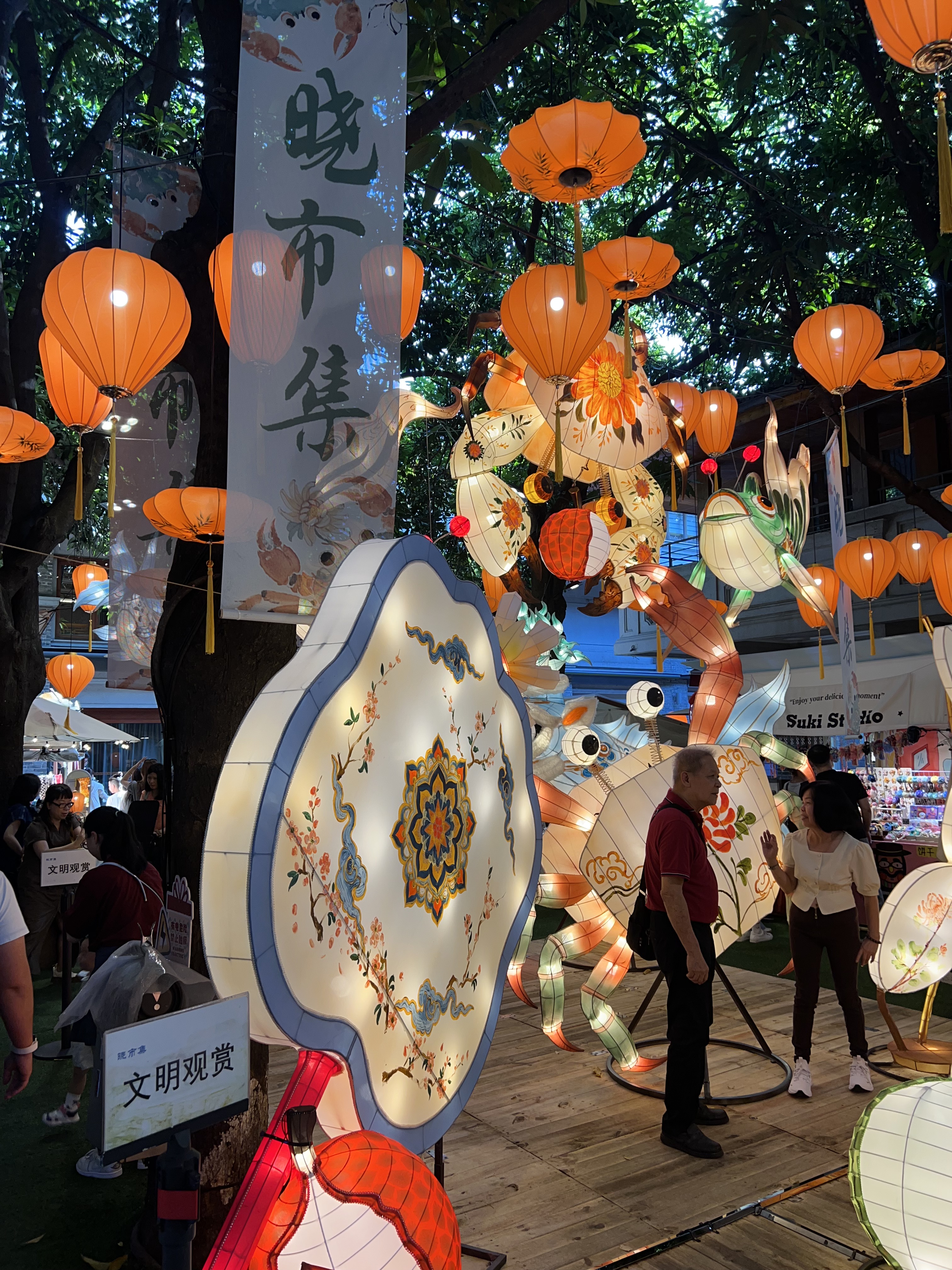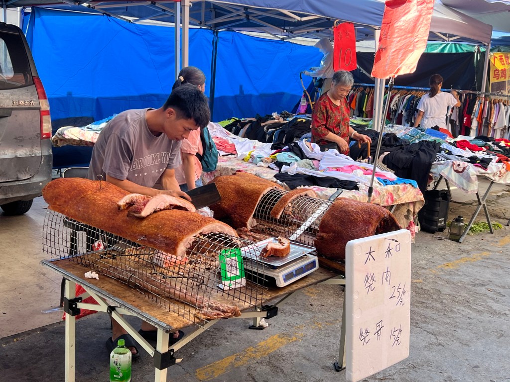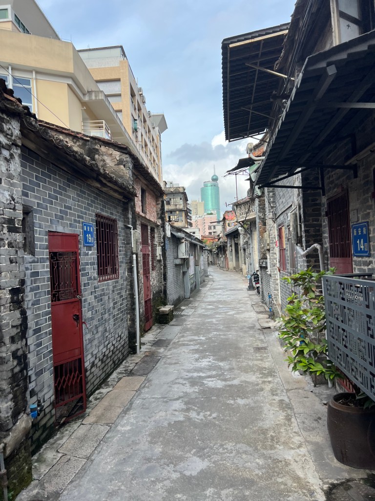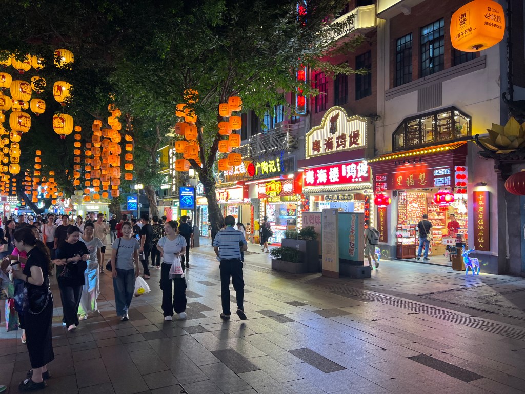 We leave the temple. Using Amap, China’s version of Google Maps which doesn’t work here, we find a night market gathering momentum. As we are going to discover throughout our visit, Guangzhou away from the skyscrapers and shopping malls is full of byroads and alleys crammed with interesting old buildings, most of them still functioning as homes or small businesses, eateries dominating. Most of this night market’s stalls are regular businesses operating out of permanent buildings. It is crowded despite the heat. I guess Saturday evening has brought out the locals.