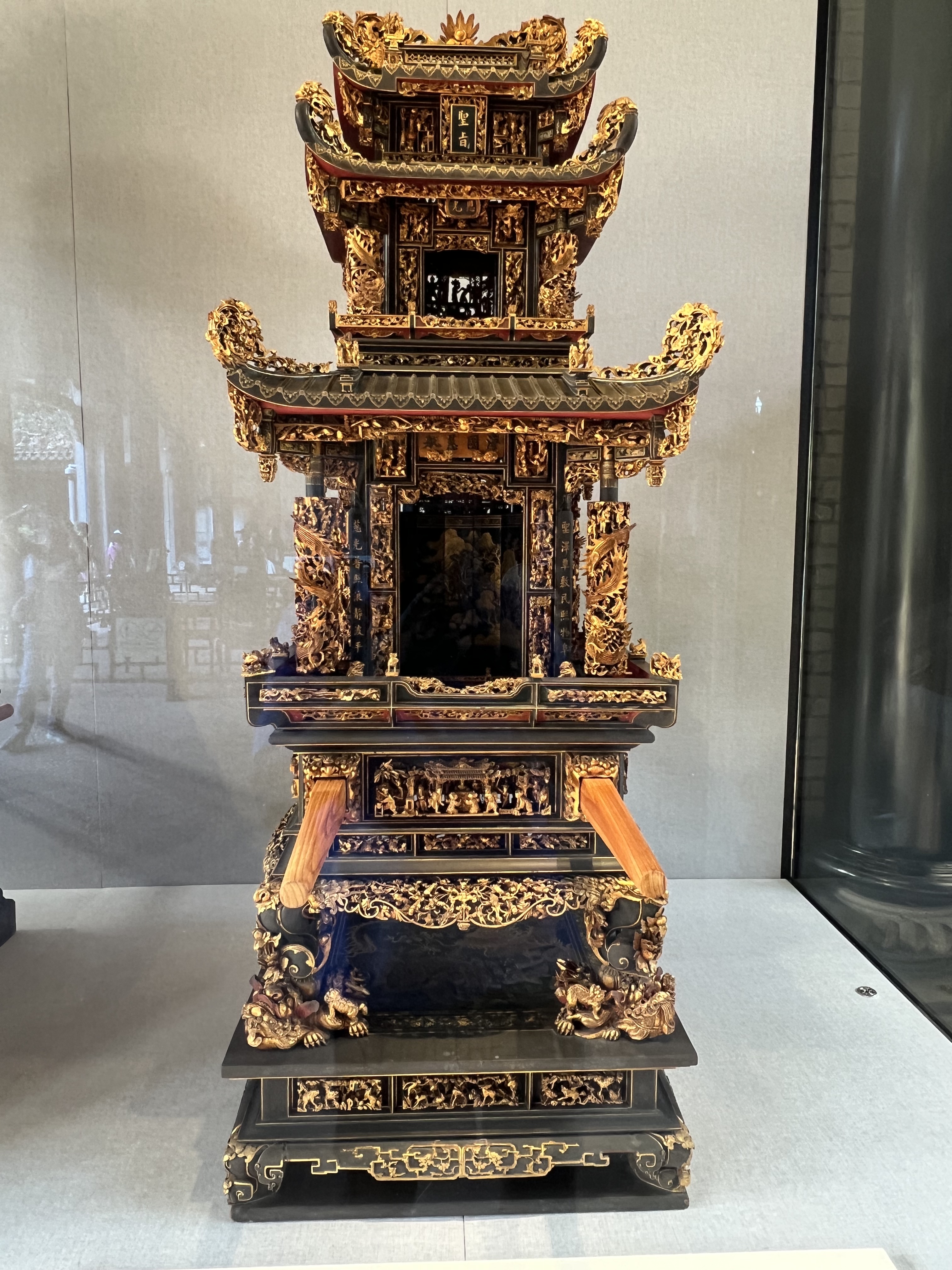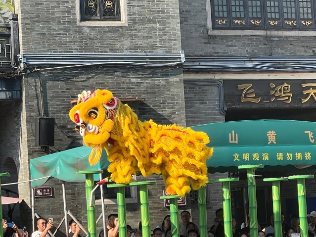 There is a large temple complex nearby and it is attracting people. I can hear drums and cymbals. We obtain tickets; at least Bock does. A venerated old person, all I need to gain free entry to such places is show my passport for proof of age. We follow the drumbeats to a square in which an energetic lion dance is in progress. Two people covered by the iconic lion costume I’ve seen in Melbourne and Singapore perform an acrobatic routine atop vertical poles planted in the ground. Another group, young men with sweat splashing off them, beat drums and clash cymbals. Impressive, above all for such high energy in the oppressive heat. Sweat’s pouring off me just standing still.