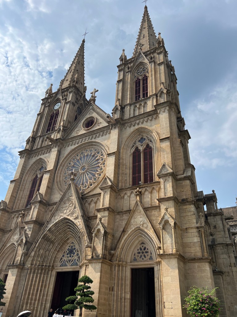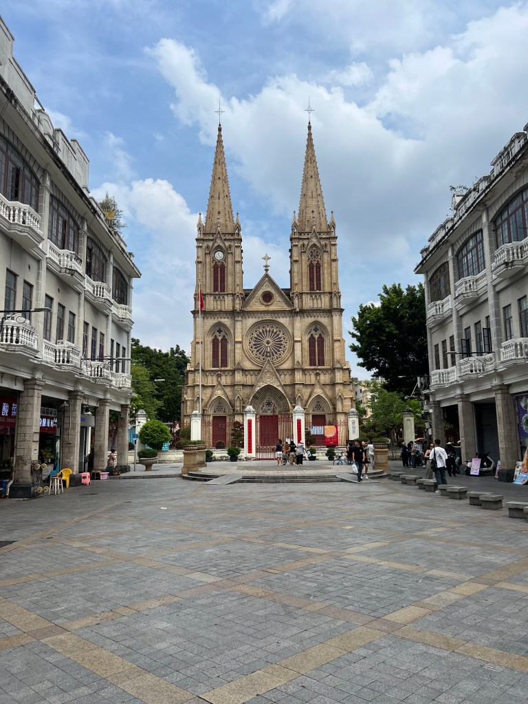 Speaking of church services, the next item on our tourist agenda is the Sacred Heart cathedral, a half-hour walk from the temple. Now midday, we learn when we get there that the cathedral will open at 2:30pm. What else to do but shop. A row of dry goods shops keeps us occupied for over an hour during which we purchase a variety of nuts and dried fruit. From there we proceed to a multi-storeyed mall whose ground floor is filled with every conceivable thing a child could desire. We get back to the cathedral at 3pm. Noteworthy as the largest gothic church in China, it is full of people, who seem to have brought in the stifling afternoon heat. I am unable to distinguish worshippers from tourists.