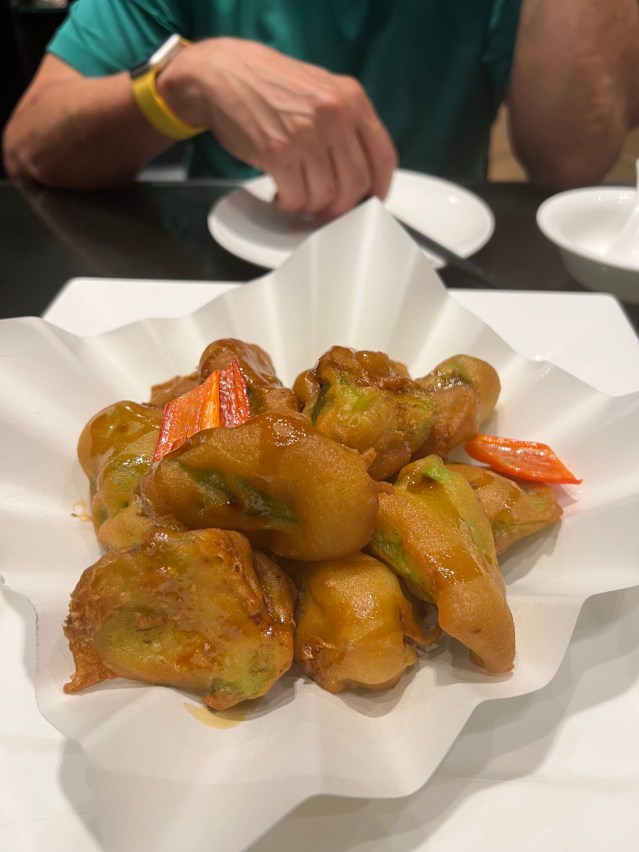 We decide to dine in the Shunde restaurant where Bock and I enjoyed eggplant in batter. It takes an hour to get there and proves to be a disappointment. The disappointments begin when the waiter says they have run out of most of the items we want. They come up the eggplant dish, but the other dishes are mediocre at best. A broth of black chicken in coconut water is a meaningless dish. Pigeon is leathery and unpleasant and I won’t be having it again. The deep fried pig innards are lamentable, cooked out of all recognition. I feel sorry for Bock. He so wanted to give his mum and sisters a memorable meal. Still, no one minds, none of us are entitled sorts. Bock’s desire is appreciated for what it is. His sincerity is never in doubt.